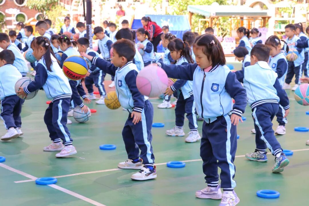 紧接着,中大班幼儿的篮球早操活力开跳 —— 孩子们或抱球伸展,或绕球跳跃,将篮球技巧与早操律动完美融合,满场跃动的身影与缤纷篮球相映成趣,朝气蓬勃的画面点亮了整个运动场。